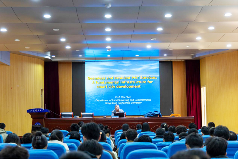 会谈后,陈武教授受邀为测绘与空间信息学院师生作题为“Seamless and Resilient PNT Services: A fundamental infrastructure for smart city development”的学术报告。他围绕PNT技术的种类、服务,以及在智慧城市建设中的挑战等方面进行报告。