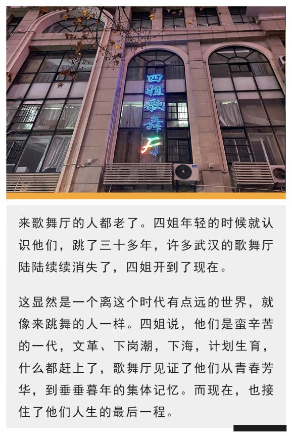 ●舞池里的男女。魏晓涵 摄舞厅里每个人都有自己的故事。四姐说,什么样的人她都见过,小商贩、地头蛇到退休干部。开第一家梦卡舞厅的时候,她才三十多岁,从梦卡、绿洲、大光明、海岛,到四丫,做了五个场子,都围着武汉热闹的江汉路周边,四丫年纪大了,舞厅的名字就变成了四姐。