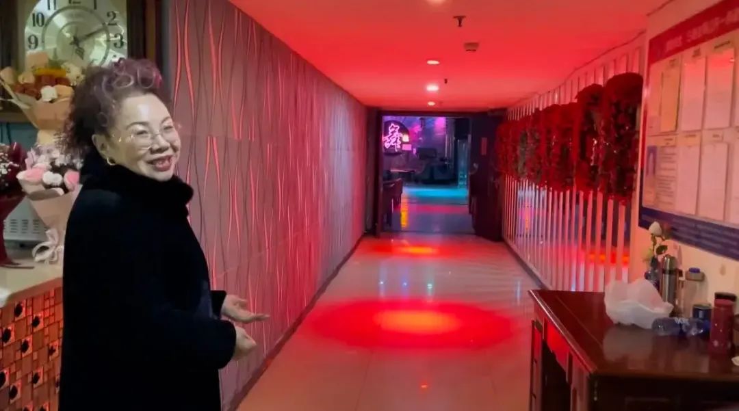七八十岁不少见,八点半去早场跳;六十多在舞厅算年轻人,中午晚上是他们的主场。十块钱换一张舞票,走廊暧昧的红色灯光通往昏暗的舞池,鼓点震动强烈,高饱和度的霓虹灯牌闪烁,满目流光溢彩。67岁的四姐在门口迎客,黑色的貂裹住玫瑰色的真丝旗袍,两串珍珠项链坠在胸前,彩色卷发高高盘起,妆容精致,笑意盈盈。