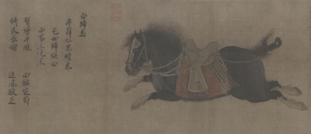 此图依据唐太宗昭陵六骏石刻而绘太宗非常喜爱自己的马儿,于是为自己建昭陵时,便用青石雕刻了六匹爱马的形象,并且亲自为他们作“赞”。