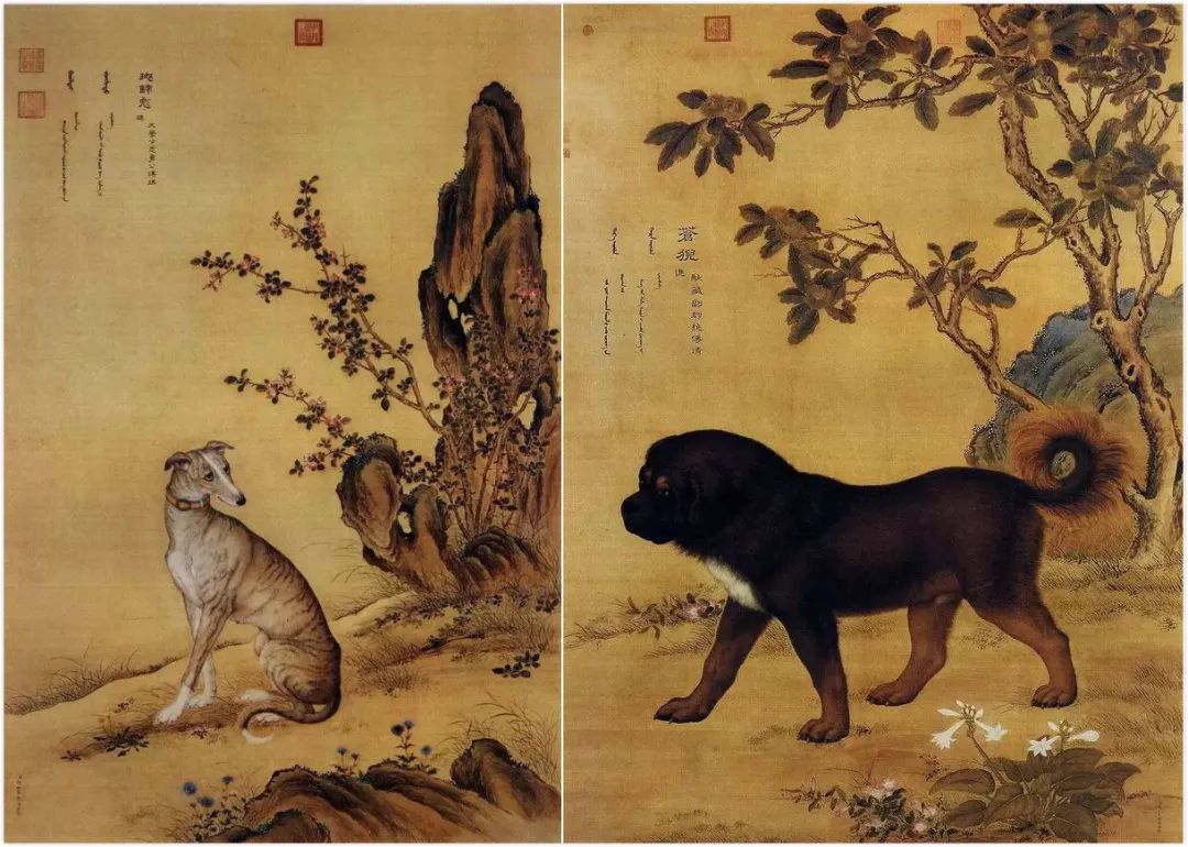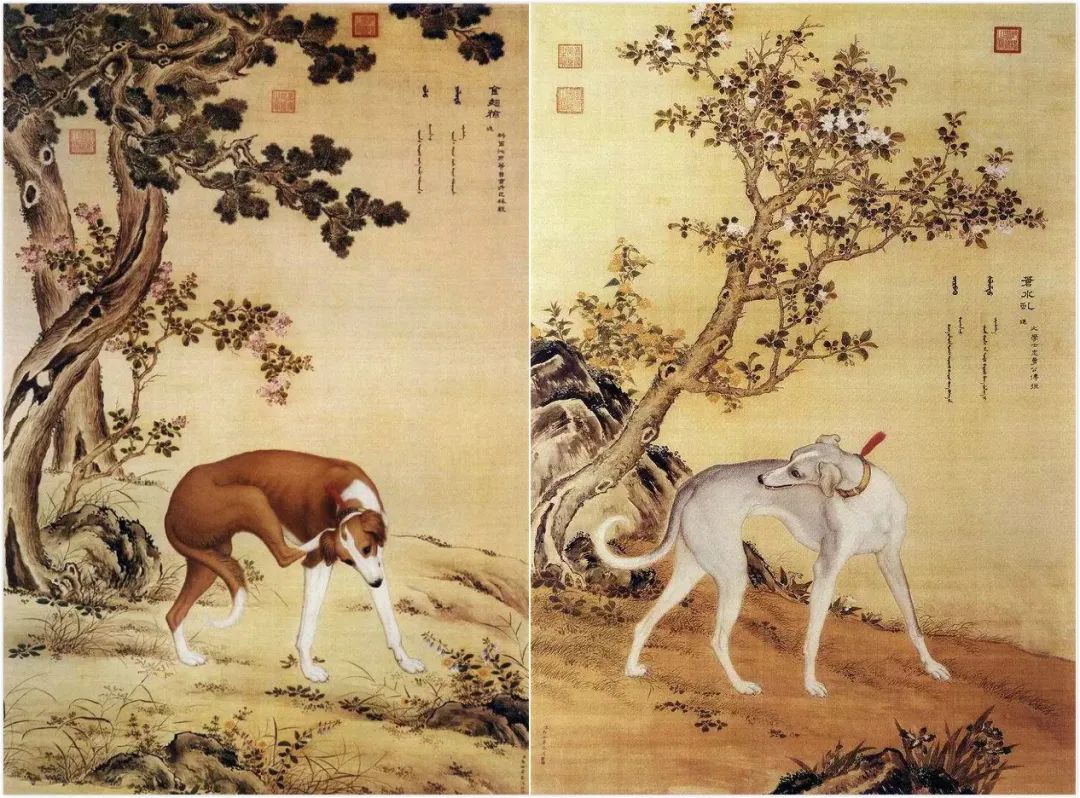 看了朴实派的狗名,再来看看文雅派的。《十骏犬图》是清朝画家郎世宁的画作,画中有十只品种名贵的狗狗。每一只都有自己的名字,分别是霜花鹞、賧星狼、金翅猃、苍水虬、墨玉璃、茹黄豹、雪爪卢、蓦空鹊、斑锦彪、苍猊。