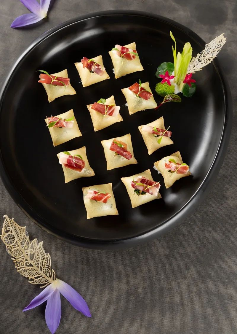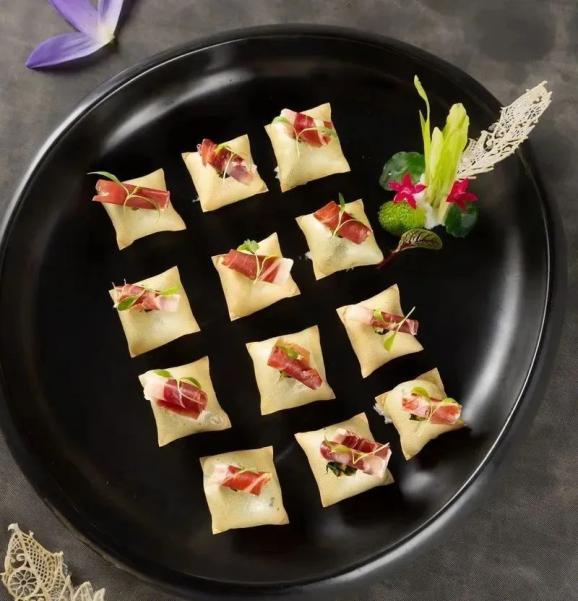 伊比利亚火腿切薄片,每片卷入一根哈密瓜条,摆在空心饼上,稍加点缀即可走菜。