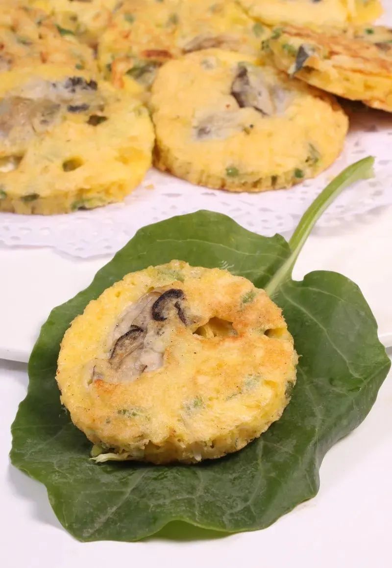 锅滑透,倒入底油后烧热,舀起一勺槐花糊,放入一颗生蚝,倒入锅中摊成圆饼,依次摊好后煎至两面金黄,取出用模具扣成边缘平滑的饼状,这样截面会露出槐花,卖相更加美观。