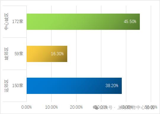 2.既存购物中心总量及分布情况2023年剔除存量改造项目,新开业的3万平方米以上购物中心中,地处中心城区(内环以内)2家,面积9.7万平方米;地处城区(内环外中环内)7家,面积55.1万平方米;城郊区(中环外,外环内)2家,面积26万平方米;远郊区(外环外)9家,面积58.9万平方米;说明2023年新开业的大多数在市郊。截至2023年底,既存购物中心(3万平方米以上)共381家,总建筑面积2825.76万平方米。其中城区(中环以内)共有172家,商业建筑面积1285.76万平方米,占总面积45.5%;城郊区59家,商业建筑面积460.5万平方米,占总面积16.3%;远郊区150家,建筑面积为1079.5万平方米,占总面积38.2%,中心城区面积占比比上年略下降,远郊区面积占比比上年略上升。