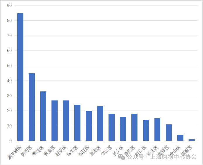 3.各区分布情况2023年新增3万平方米以上购物中心,浦东新区新增8家,普陀区新增3家,闵行区、嘉定区、徐汇区、松江区各新增 2家,静安区新增1家。截至2023年底,购物中心数量最多的是浦东新区达85家,其次是闵行区45家,黄浦区33 家,青浦区27家,静安区27家,徐汇区24家,嘉定区23家,松江区20家,宝山区18家,普陀区18家、长宁区16家、杨浦区15家,虹口区14家,奉贤l1家,金山区4家,崇明l家。