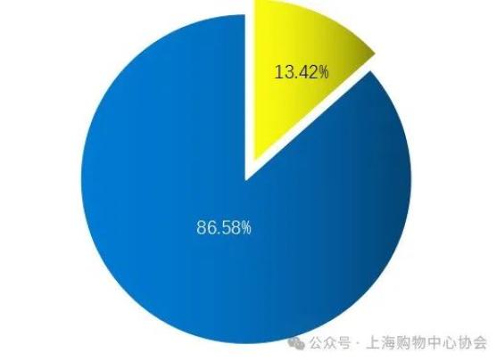 二、2023年上海购物中心经营情况根据上海市有关商业机构的信息数据和对部分重点购物中心抽样调研,2023年各购物中心经营快速复苏回暖,经营业绩不断向好,经营规模平均同比上升21.2%,一些经营调整快、营销亮点多的购物中心,经营业绩接近或超过了2019年规模;一些运营质量高的购物广场、奥特莱斯同比增幅达30%左右,有的增幅达65%~115%,2023年上海3万平方米以上购物中心经营总规模为2475亿元左右,经营总额占全市社会消费品零售总额13.42%,比上年增加了0.82个百分点。2023年购物中心对社会消费品零售总额的贡献率,如图: