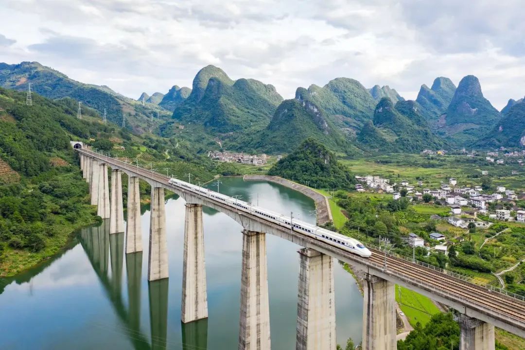 @图虫创意阳朔至广州方向,有一段线路将中国桂林山水的浪漫展现的淋漓尽致,喀斯特地貌在云层中若隐若现,田野上的房屋星罗棋布, 这样一段列车画面也被网友称作“中国最美山水列车。”