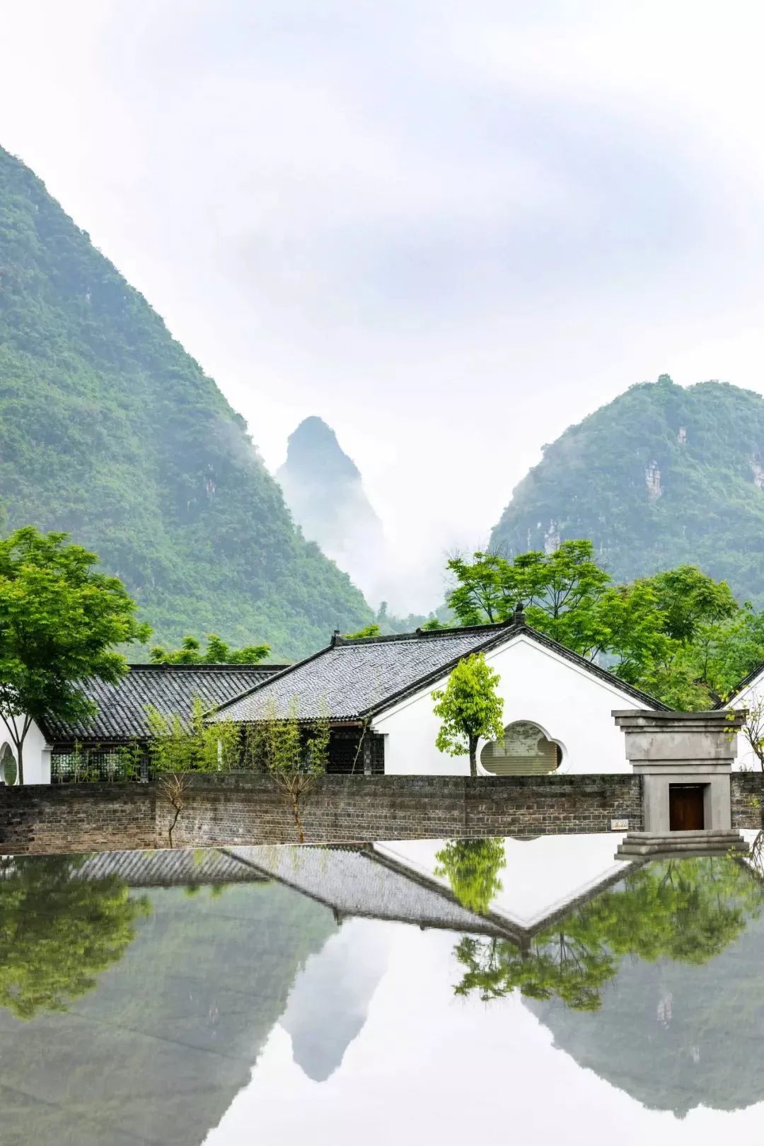 设计师将巴厘岛风格与传统桂北民居完美结合,整个设计低调,简约,奢华的中式白墙灰瓦倒印在山水里,宛若天成。