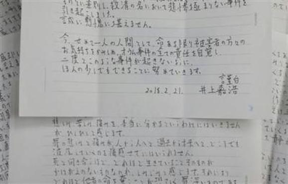 ▲井上嘉浩的手写忏悔信,称“对奥姆事件负有全部责任”2018年1月22日,《朝日新闻》发表报道称,像“奥姆真理教”这样的末日邪教毒瘤远未清除。如果我们只是简单认定该组织只是一个独立在我们社会之外毫不相干的“邪教”,那就意味着我们并没有从沙林毒气惨案中吸取深刻教训。