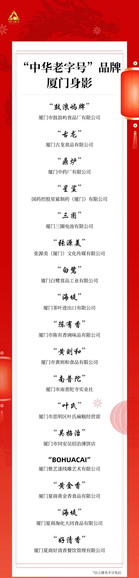 截至目前,厦门共有“中华老字号”17家、“福建老字号”20家、“厦门老字号”116家。