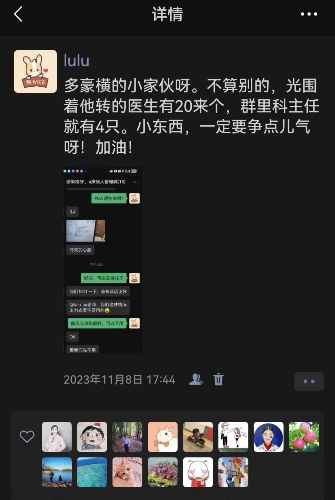 明知治疗重重困难,21个人的医生团队和护理团队一起全力以赴,用自己的方式全力守护星星。“感染楼5F,4床病人管理群”这个为星星一个人成立的群里,每天都不断跳出新消息,不管多晚,也总有人打开手机回复。
