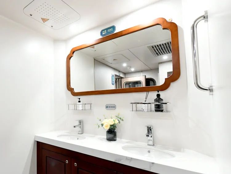 什邡号“熊猫专列”车身内外提取三星堆青铜立人像色彩,配合古蜀之源图形、“熊猫专列”徽章和什邡号专属图标等,同时,增加了旅客反响较好的高级软卧车和高级硬卧车数量,对车内消防和降噪设施进行优化升级,并对包房、淋浴室智能化设施设备完成合理化改造,让旅客体验更美好。