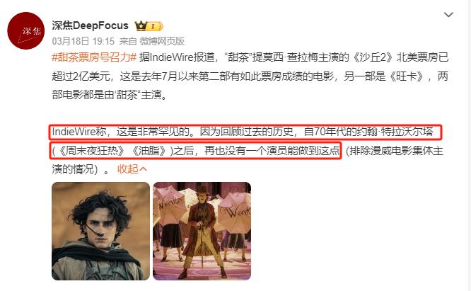 由他主演的电影《旺卡》与《沙丘2》,连续8个月稳居北美票房的榜一榜二。要知道,这可是自70年代的约翰·特拉沃尔塔之后,第一位实现这一成就的演员。