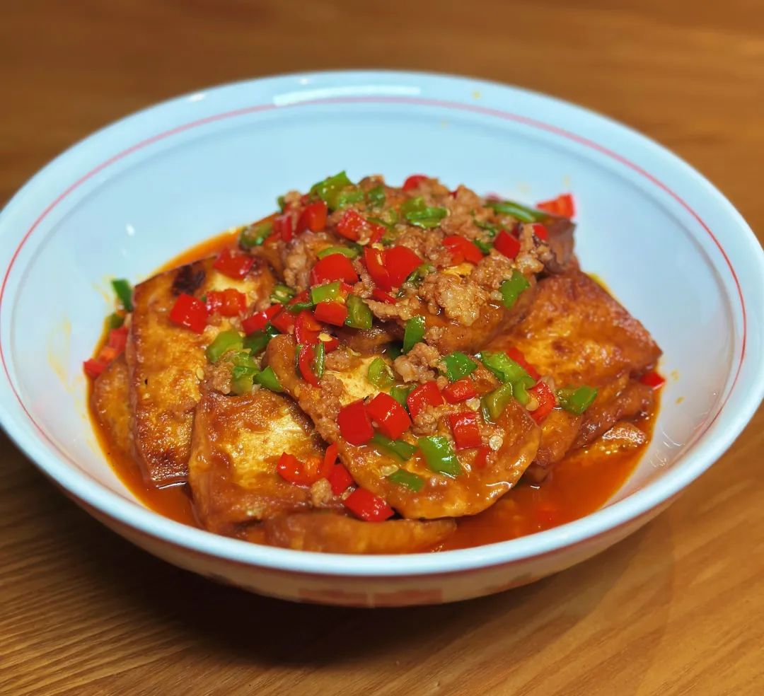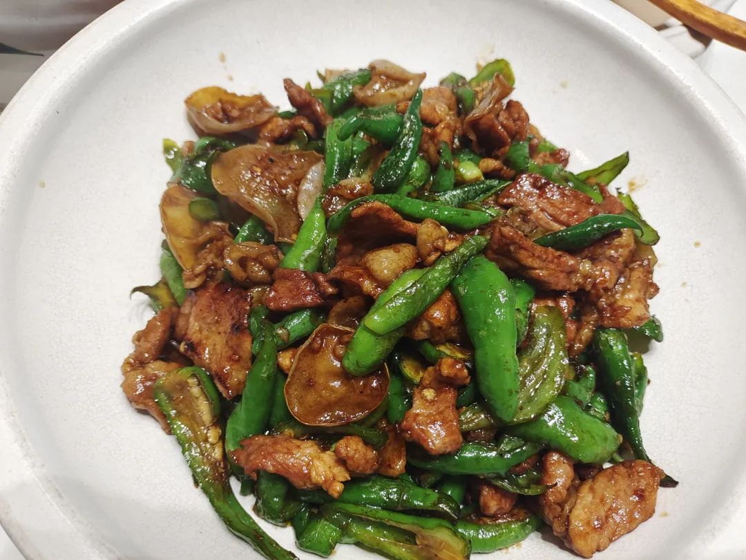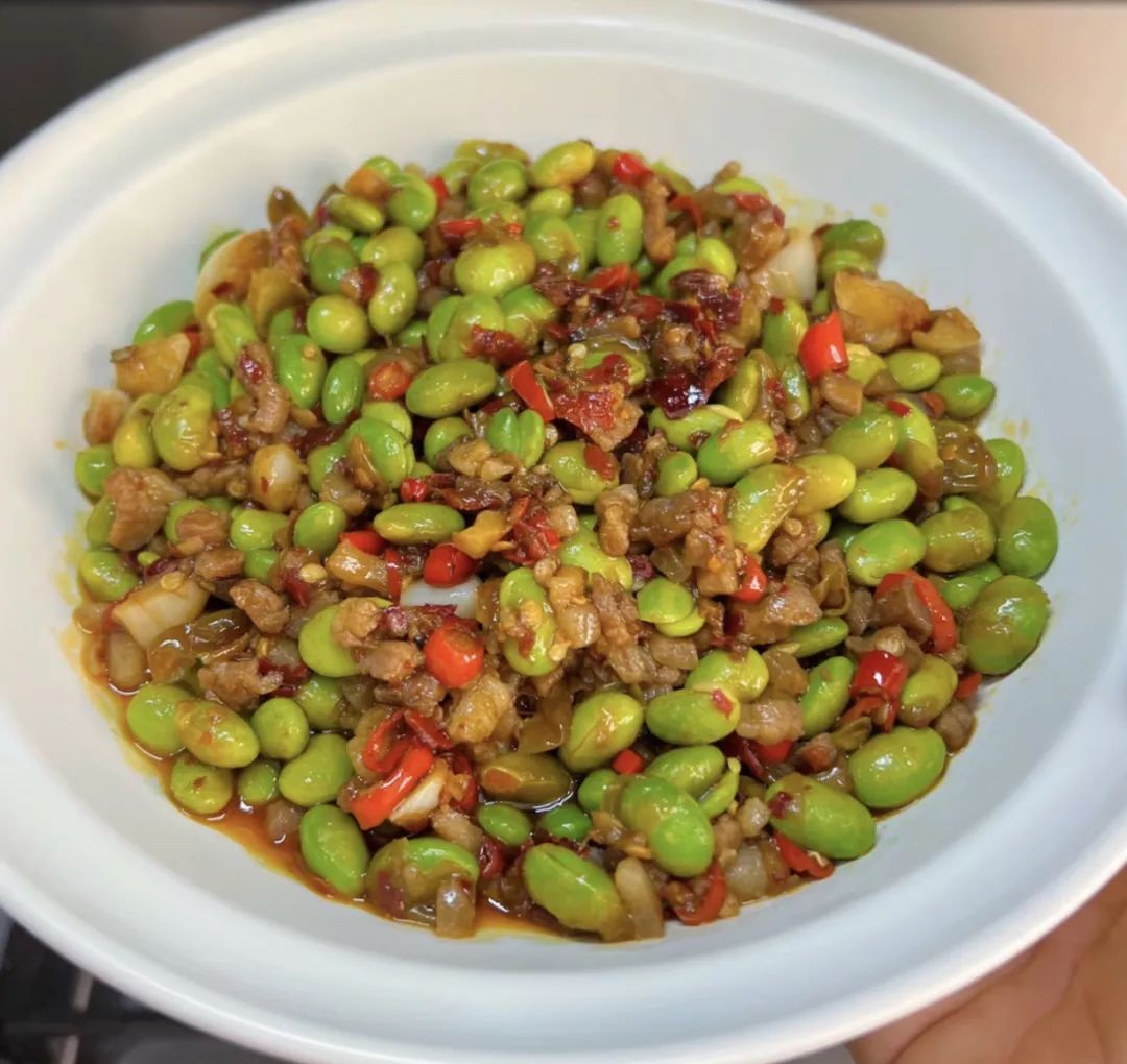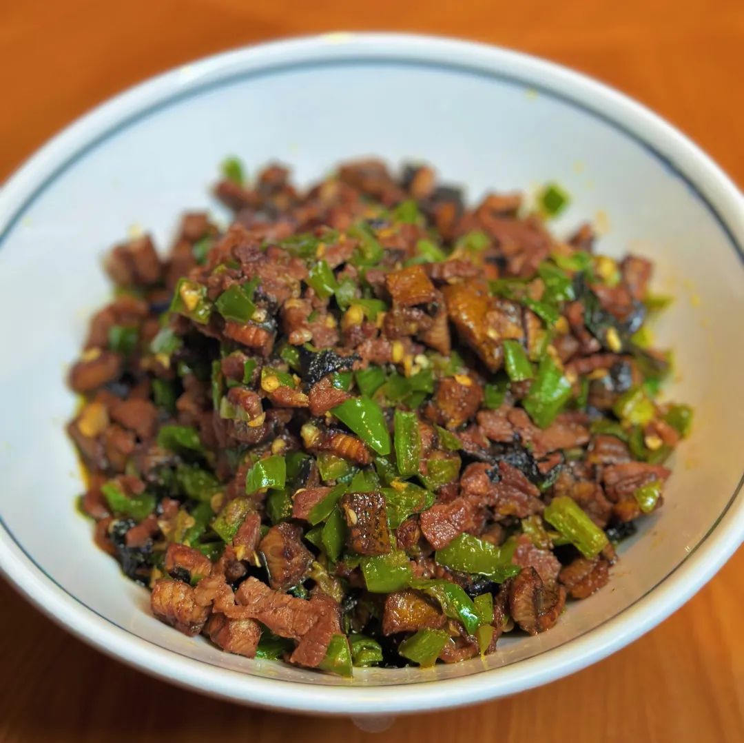 肥瘦相间的五花肉加上蒜末、干辣椒粉爆炒