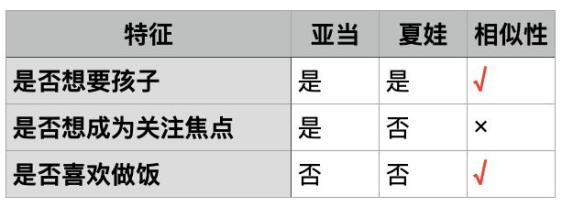 为简单起见,我们对比了两位用户关于三个特征的回答。亚当想要孩子,喜欢成为关注的焦点,不喜欢做饭。夏娃也想要孩子,不喜欢成为关注的焦点,也不喜欢做饭。