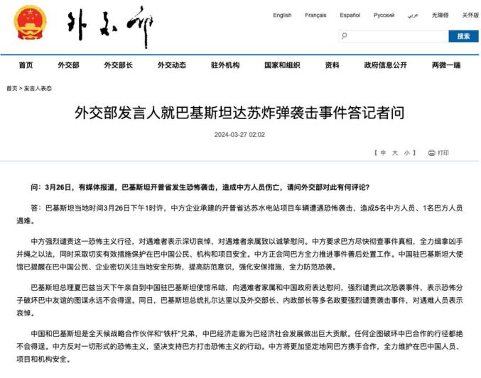 据外交部消息,外交部发言人就巴基斯坦达苏炸弹袭击事件答记者问。
