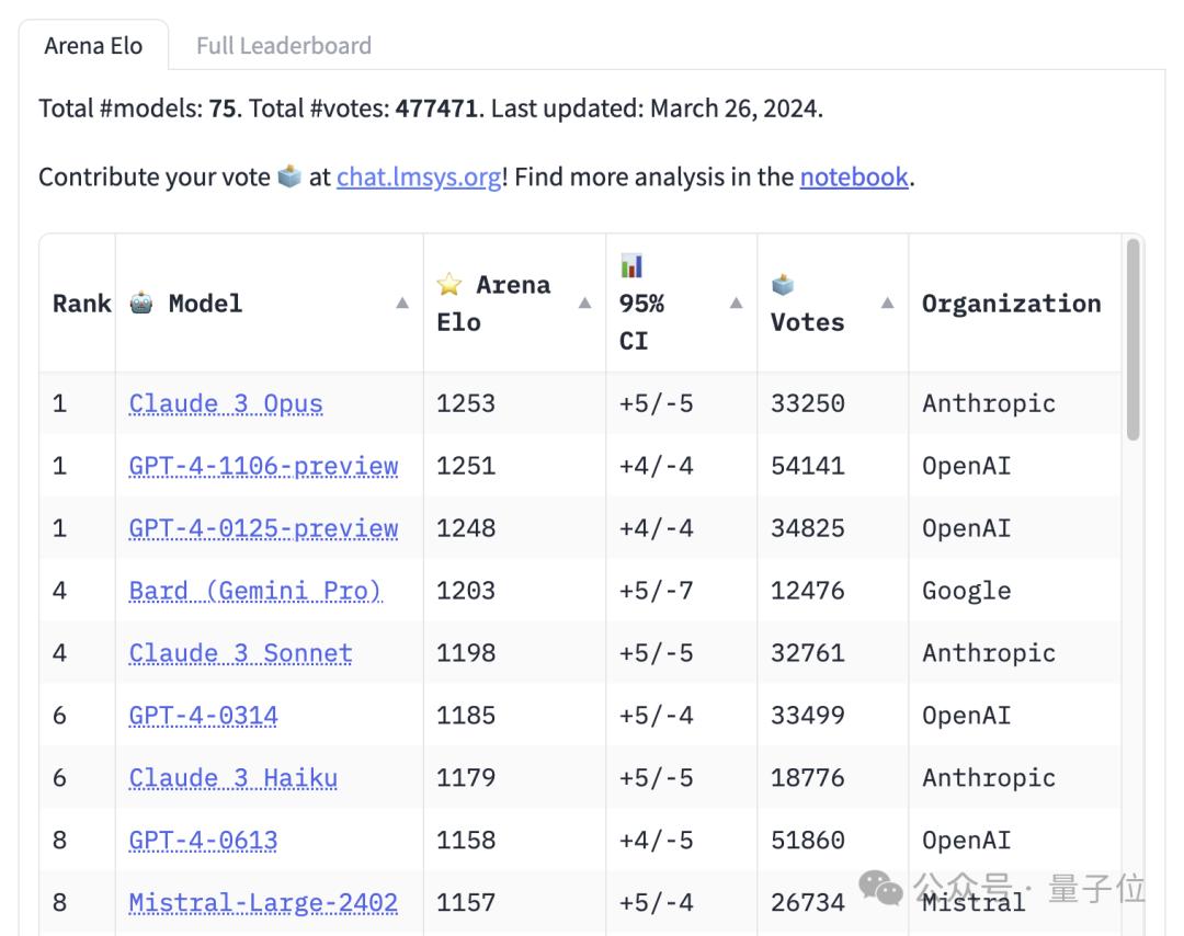 大模型竞技场上,Claude 3大杯Opus新王登基,Elo分数来到榜首。
