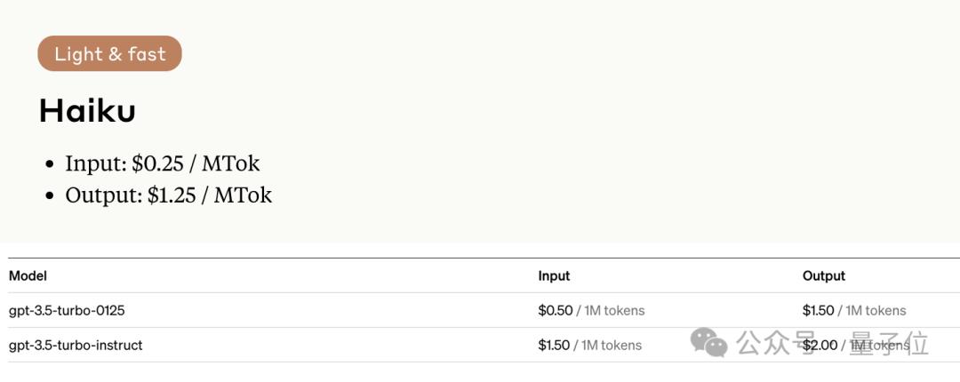 Haiku的输入token价格,可是比GPT-3.5-turbo还便宜了一半,输出方面,每100万token也比GPT-3.5-turbo便宜近2块钱。