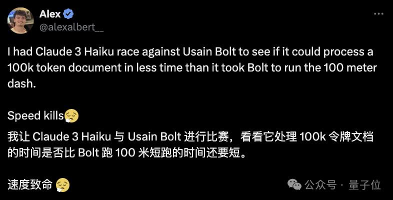 具体有多快,已经有网友做了个直观的对比:博尔特还没跑完100米,Haiku已经读完100k token的文档了……