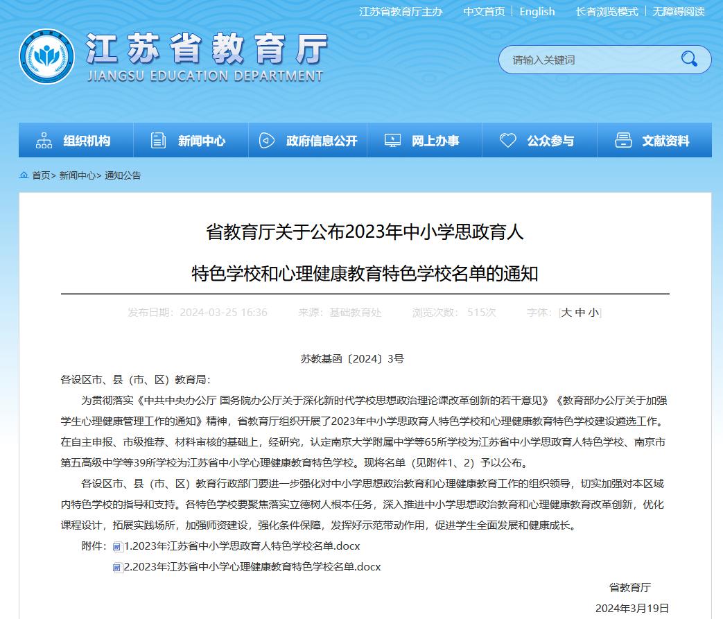 为贯彻落实《中共中央办公厅 国务院办公厅关于深化新时代学校思想政治理论课改革创新的若干意见》《教育部办公厅关于加强学生心理健康管理工作的通知》精神,省教育厅组织开展了2023年中小学思政育人特色学校和心理健康教育特色学校建设遴选工作。在自主申报、市级推荐、材料审核的基础上,经研究,认定南京大学附属中学等65所学校为江苏省中小学思政育人特色学校、南京市第五高级中学等39所学校为江苏省中小学心理健康教育特色学校。