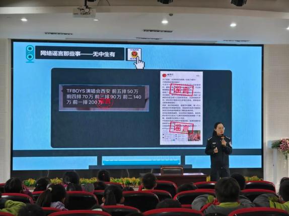 在宁波镇明中心小学的阶梯教室里,宁波网安支队民警带领同学们识别谣言变种、防止信息泄露、避免信谣传谣。