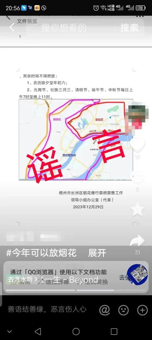梁某雄看到该文件上写有长洲区部分地区不再禁止燃放烟花爆竹后,未经核实就截图做成视频在某短视频平台上发布,并配文“今年可以放烟花了”,导致部分群众信以为真将该不实消息扩散。