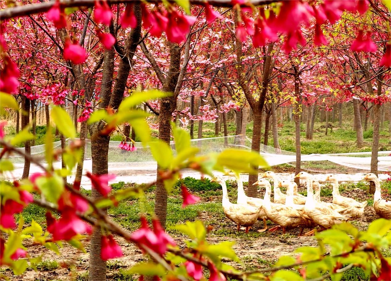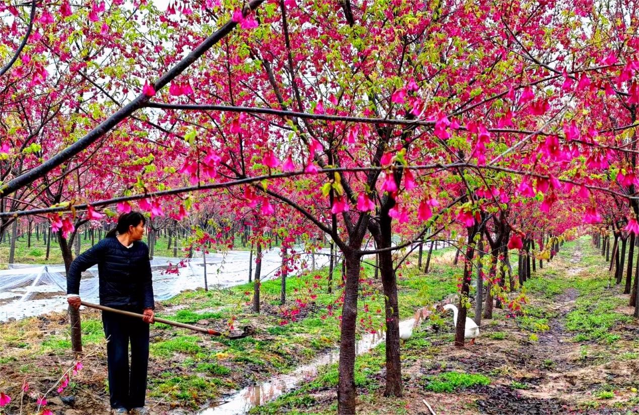 此处樱花园占地63亩。10年前,鲁淑云一家去台湾探亲,已是高龄的叔父一生最喜爱樱花,他送给鲁淑云几株樱花树苗,希望能在家乡种植。从10年前的几株樱花树发展至今,成为当地小有名气的网红打卡点,据介绍,在盛花期时,每天来赏花的游客有300多人。在樱花树幼苗间,在林间套种一季麦一季黄豆,随着幼苗渐渐长大,鲁淑云就开始搞林下养殖,每年喂500多只鹅和500多只鸡让鸡群觅食昆虫、嫩草等,既减少人工除草的费用,又因为生态养殖的鹅、鸡下的蛋口感非常好,每年仅此一项收入都很可观的。“我只是卖树苗,已经收入30多万元了,现在游客来了,我准备延伸‘一枝樱’的链条,只要肯干、想干,想不富都难……”鲁淑云信心十足。