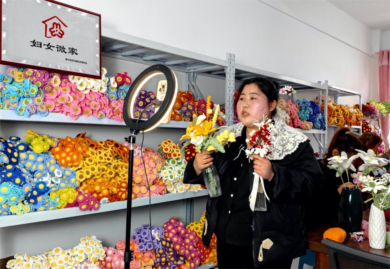 “我左手是垂丝茉莉拼成的,右手铃兰、郁金香、薰衣草等组合成的,大家看看,美不美、够不够,不够,我再送……宝宝们快点进小黄车下单。”3月27日下午,王梦碟在工作室直播着。回想起第一次将自己编织的“花”拿出去售卖的情景,形状各异、鲜活别致的花艺品一摆上来,很快就被抢购一空。“那一天就挣了2000多元,还有人跟我预订。”王梦碟激动地说。近两年又上网销售,现在每年纯收入20多万元,带动60多位留守妇女就业。“不要小瞧这一根钩针和几团毛线,我们靠着这些小物件不仅守住了家,还挣到了钱!”王梦碟笑呵呵地说道。