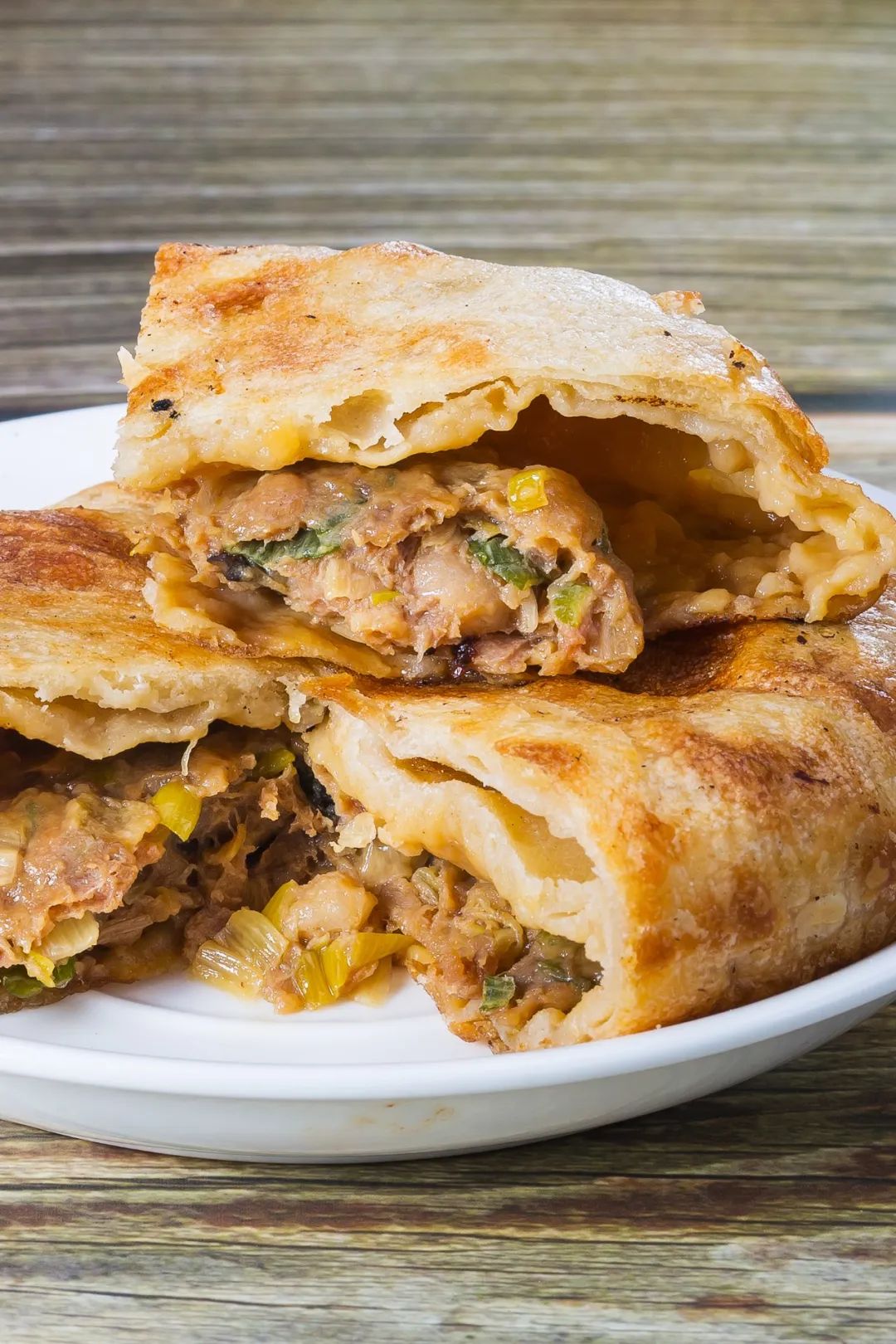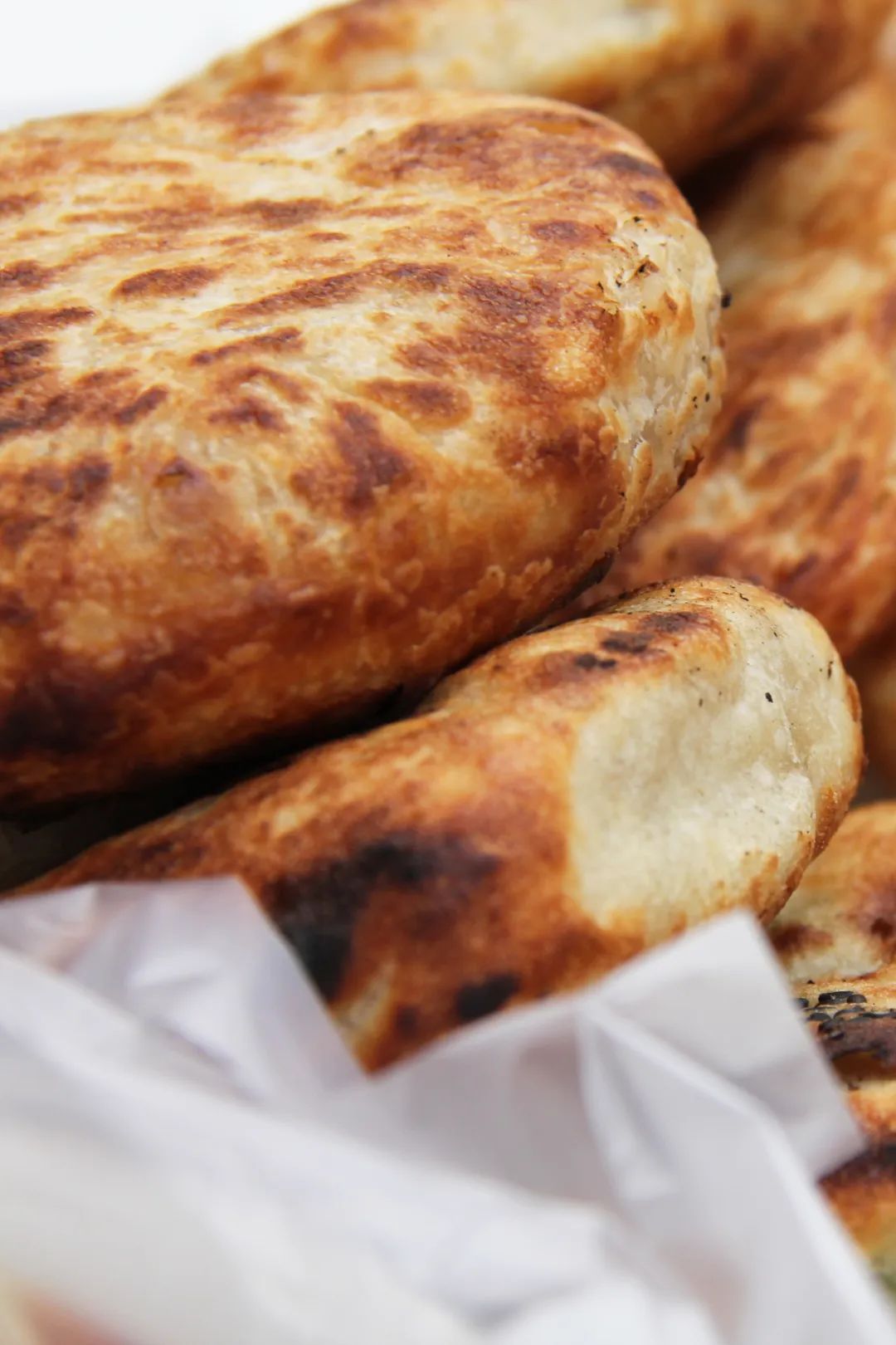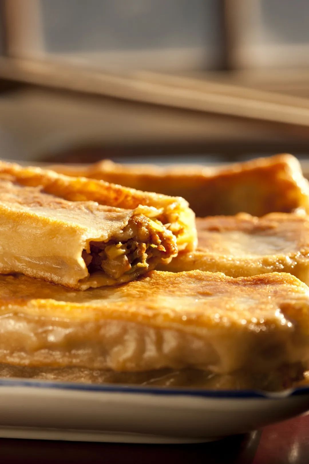 这是一种不走寻常路的火烧。你看它怎么做的:先取一剂面,擀薄薄的,放馅儿,然后开始内卷它,卷成一个方棍子,最后把两边多出来的面一搭,原本散漫的馅儿就被紧实地包裹起来。放油锅里一煎,等到两面金黄,出锅。