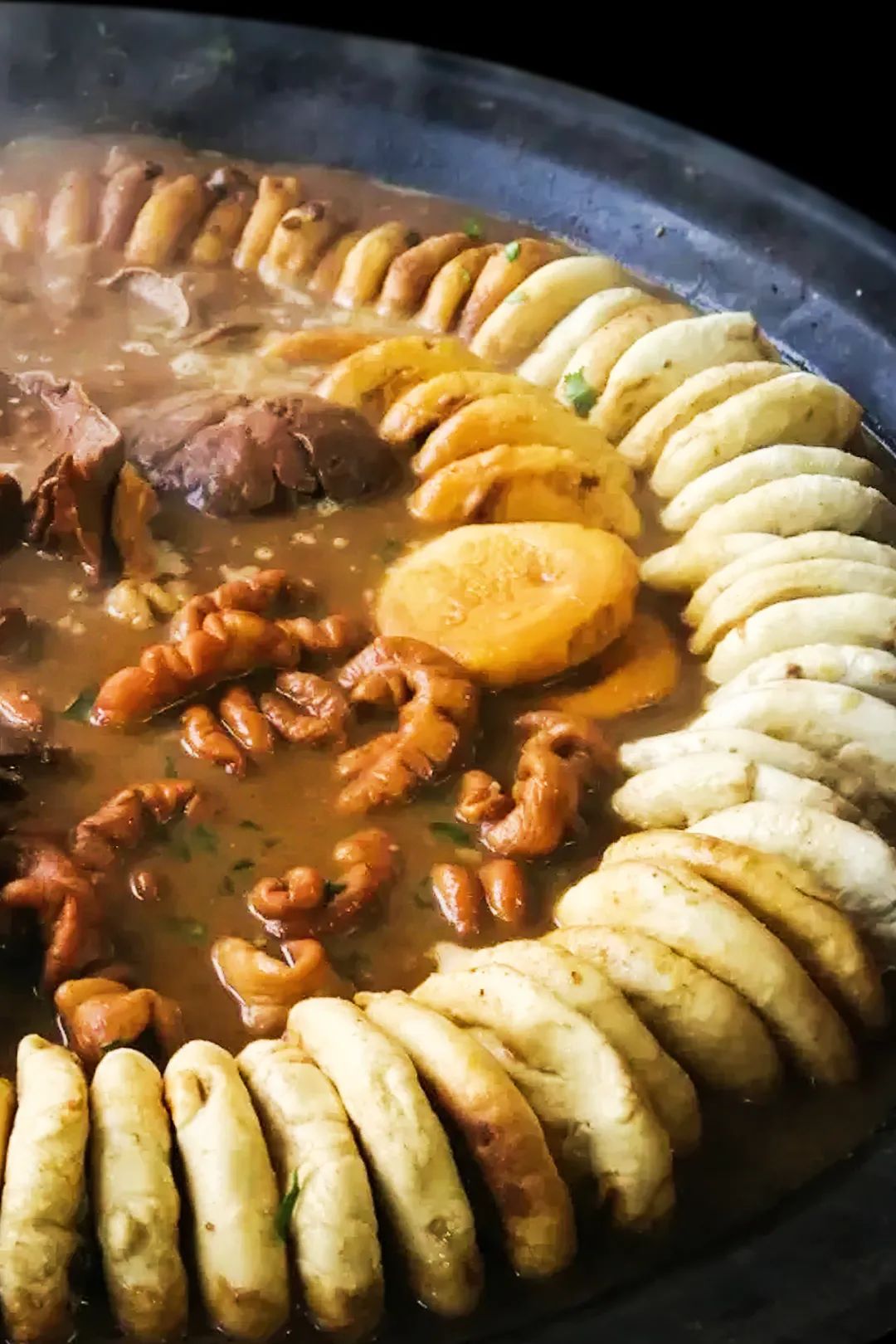 本来,它只是一枚硬气的白面饼,煮久了以后,吸足汤汁,变了色,有了味,和这一锅料“色味相投”。