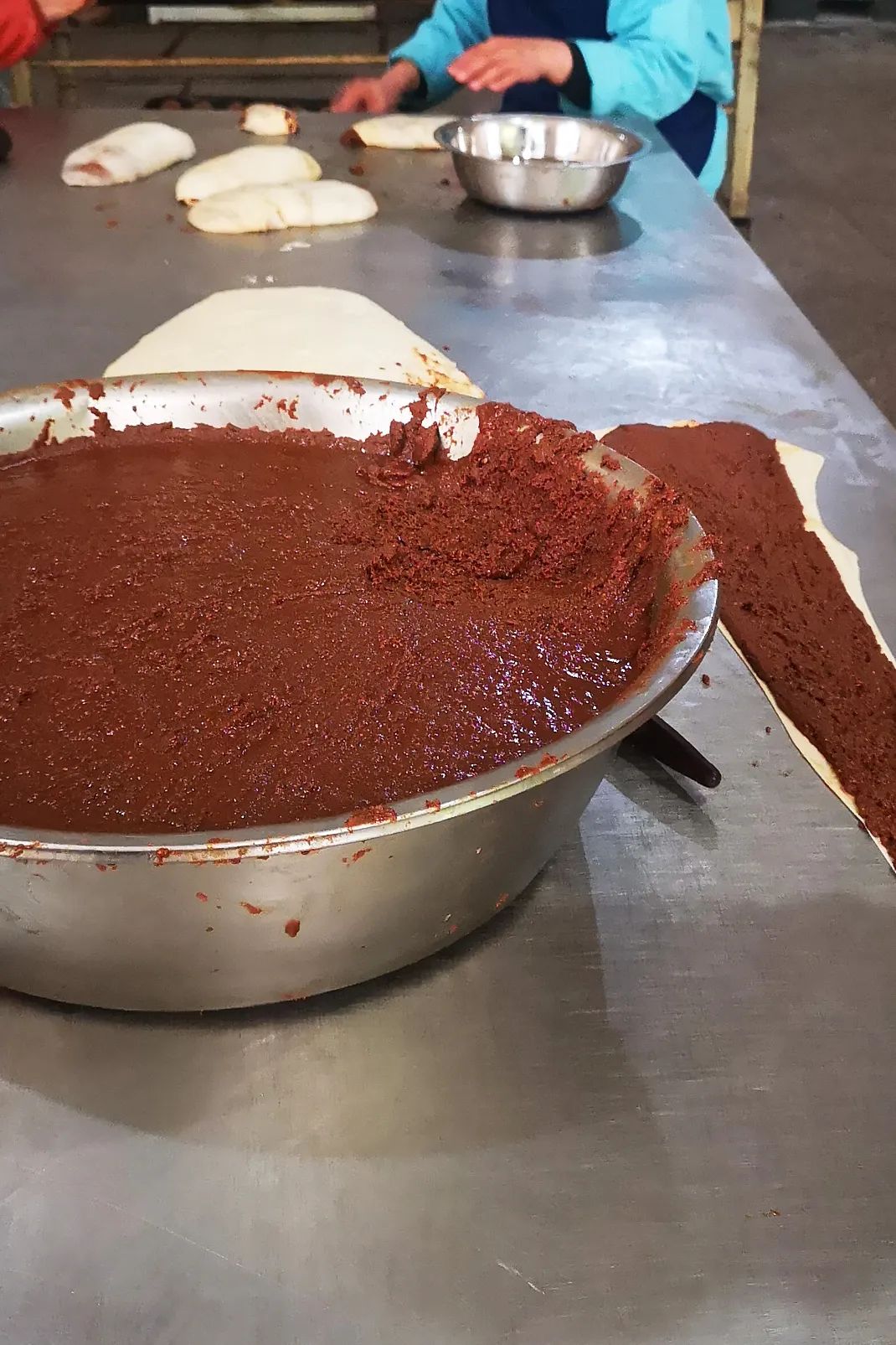 糖火烧的原料,一般只有面粉、芝麻酱、红糖,最多再加一点香油、桂花糖。想要好吃,就不能让面粉控了股。据说北京某老字号做出来的糖火烧,面粉只占25%;芝麻酱、红糖、桂花、香油“调和”到一起的料,却占到75%!