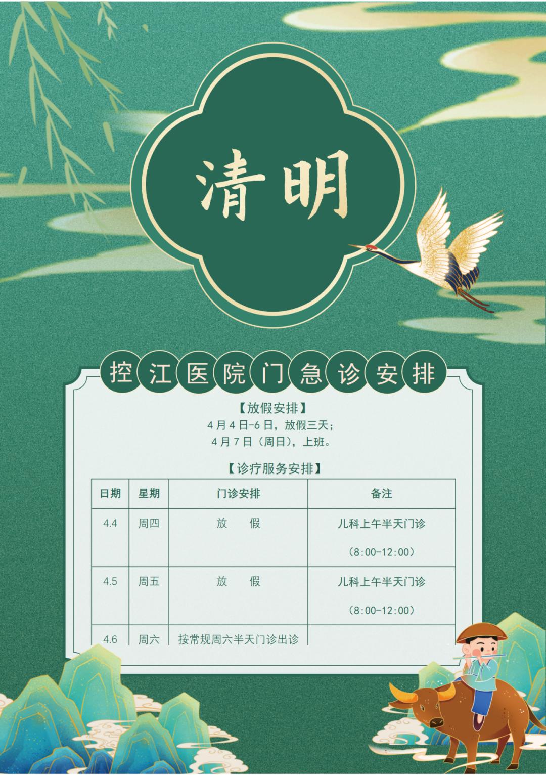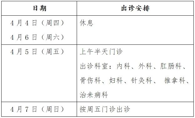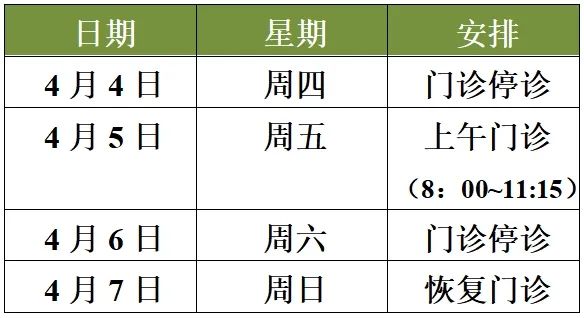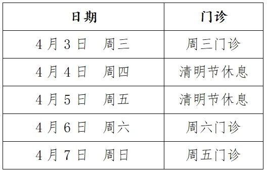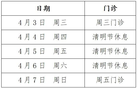 根据国务院对节假日放假的规定,现将2024年清明节期间门诊安排通知如下: