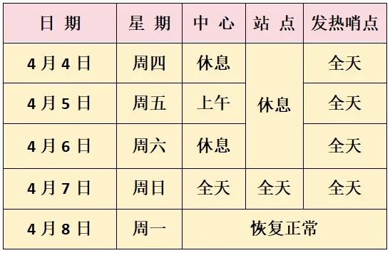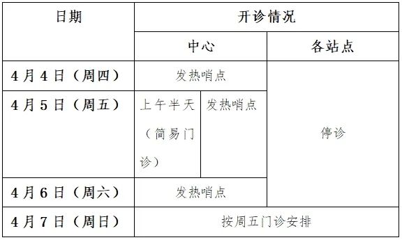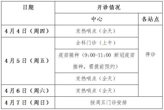 备注:各社区卫生服务站点暂停开放,4月7日(周日)正常门诊。