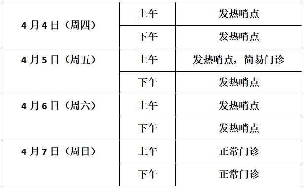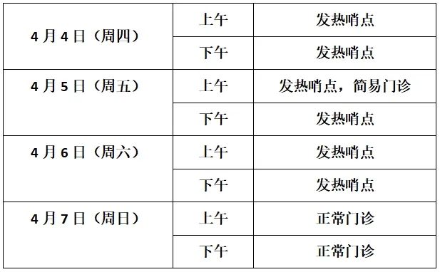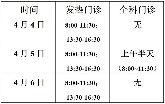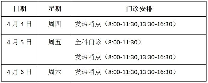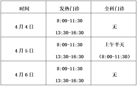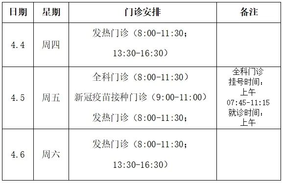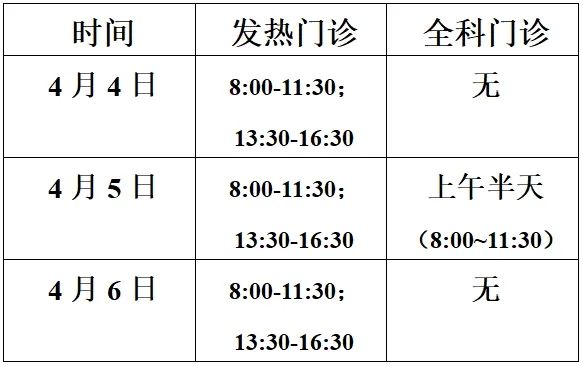 发热门诊:4月4日-4月6日 8:00--11:30、13:30--16:30