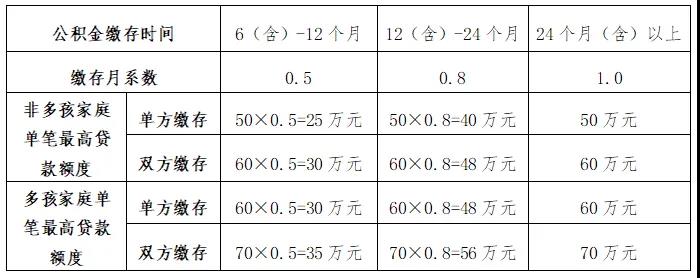 多孩缴存职工家庭在本市购房申请住房公积金贷款,最高贷款额度在现行政策规定上提高10万元,即单方缴存住房公积金的,公积金最高贷款额度提高到60万元,夫妻双方连续足额缴存住房公积金,公积金最高贷款额度提高到70万元。