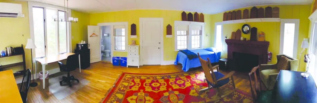 MacDowell文艺营有近30个小studio供艺术家居住,分布在可步行到达的树林里。张爱玲于3月13日在大厅里遇到了德裔美国剧作家和作家赖雅。性格开朗风趣,永远不乏谈资的赖雅让张爱玲很喜欢和他聊天,赖雅也一下子就很喜欢这位端庄大方,优雅亲和的中国女子,时年赖雅65岁,张爱玲36岁。他们很快从大厅来到人更少的回廊聊天,随后就开始单独拜访彼此的studio了。很遗憾文艺营没能留下张爱玲居住的studio名称记录,管理员Dan很友善,在我近乎央求下破例让我进到赖雅当年住过的Mansfield studio45参观且拍照,就是在这里他们讨论艺术和中国书法,以及张爱玲的小说「秧歌」和「粉泪」。最重要的是,他们在这里定下情缘,并于同年8月在纽约短居时结婚。上图是全景摄影,可看到房间整个布局,实际上要小很多。冬季时窗外是大雪覆盖的树林,他们在小小壁炉的温暖火光中该是怎样的惺惺相惜,感念这千里有缘来相会啊!