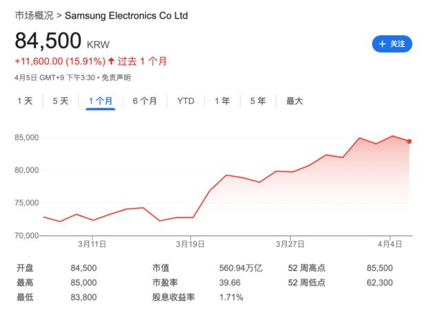 4月5日,三星在其初步财报中称,今年第一季度的营业利润为6.6万亿韩元(约49亿美元),高于去年同期的6400亿韩元。这也创下了三星自2022年第三季度以来的最高营业利润纪录。第一季度营收将同比增长11%至71万亿韩元。