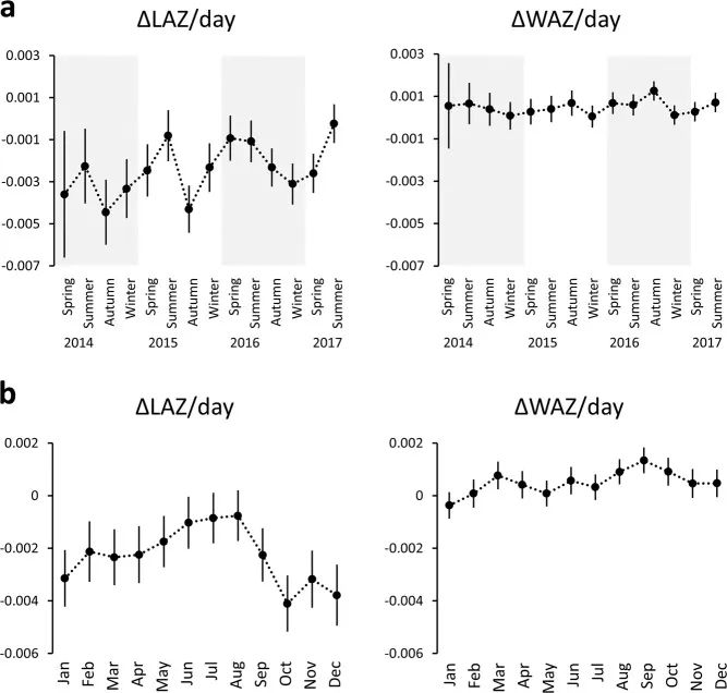 实验数据来源:2014年到2017年日本的9,409名婴儿的生长发育数据对比还有一个有意思的点,就是冬季,大家没有感受到体感上的“串个子”,但是体重的增长会比较快,这个可能也跟我们这个能量蓄积,或者说我们可能活动量少,也有关系。