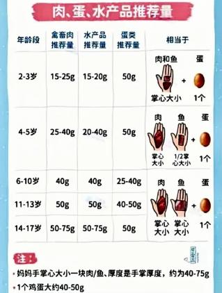 首先,我们肯定要保证蛋白质基础摄入量,孩子每天要吃50~75g的瘦肉类,一巴掌的肉,差不多就是他每天的量。