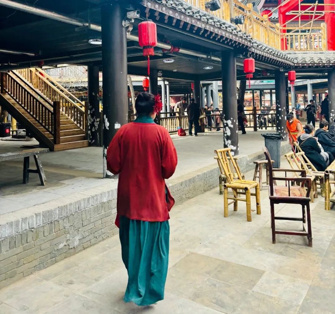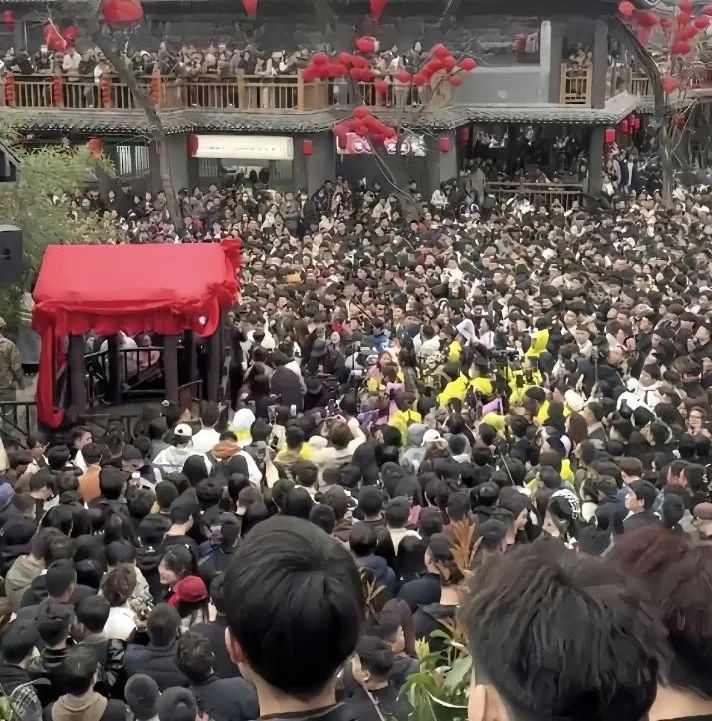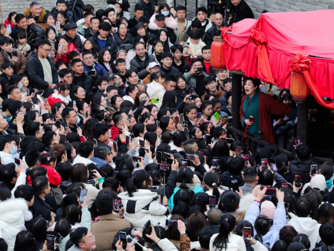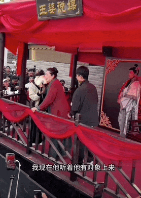 “王婆说媒”现场2024年3月,经由网络传播,“王婆说媒”栏目突然爆火。赵梅将演出时长延长至1个小时,依旧无法满足台下日渐汹涌的人群。3月13日,景区不得不发布公告,对演出场地紧急施工,升级设备。