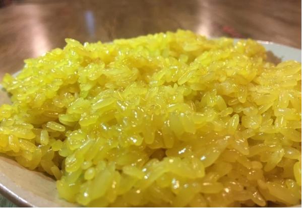 黄色糯米色受当时条件限制,多数家庭仅有黑色糯米饭和黄色糯米饭两种,长大后才发现原来还有五色饭。从小到大,一直喜欢家乡的黑色糯米饭和黄色糯米饭,即使上了年纪,这种喜欢只会越来越浓。