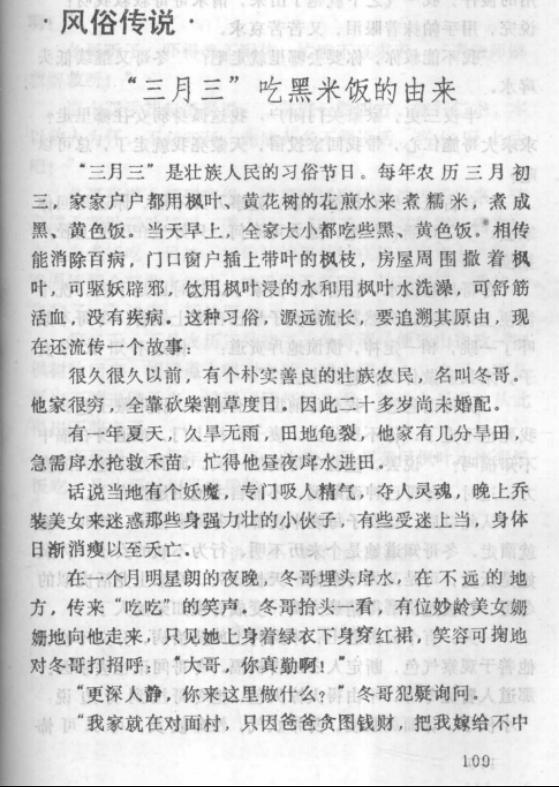 “三月三”是壮族人民的习俗节日。每年农历三月初三,家家户户都用枫叶、黄花树的花煎水来煮糯米,煮成黑、黄色饭。当天早上,全家大小都吃些黑、黄色饭。相传能消除百病,门口窗户插上带叶的枫枝,房屋周围撒着枫叶,可驱妖辟邪,饮用枫叶浸的水和用枫叶水洗澡,可舒筋活血,没有疾病。这种习俗,源远流长,要追溯其原由,现在还流传一个故事:很久很久以前,有个朴实善良的壮族农民,名叫冬哥。他家很穷,全靠砍柴割草度日。二十多岁尚未婚配。有一年夏天,久旱无雨,田地龟裂,他家有几分旱田,急需戽水抢救禾苗,忙得他昼夜戽水进田。