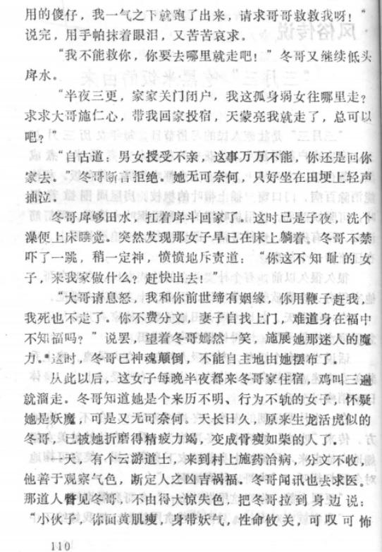 从此以后,这女子每晚半夜都来冬哥家住宿,鸡叫三遍就溜走。冬哥知道她是个来历不明、行为不轨的女子,怀疑她是妖魔,可是又无可奈何。天长日久,原来生龙活虎似的冬哥,已被她折磨得精疲力竭,变成骨瘦如柴的人了。
