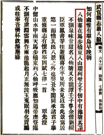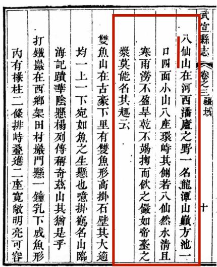 清代《武宣县志》载:“八仙山,在河西潘卢之野,一名龙潭,山巅方池一口,四面小山八座,环峙其侧,若八仙然。水清且寒,雨涝不盈,旱干不竭,掬而饮之,俨如帝台之浆,莫能名其趣云。”