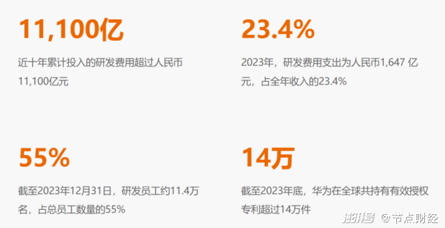 我们先来看一组数据:2023年华为研发投入为1647亿元,是销售收入的23.4%。过去十年,华为累计投入的研发费用已经超过了1.11万亿。