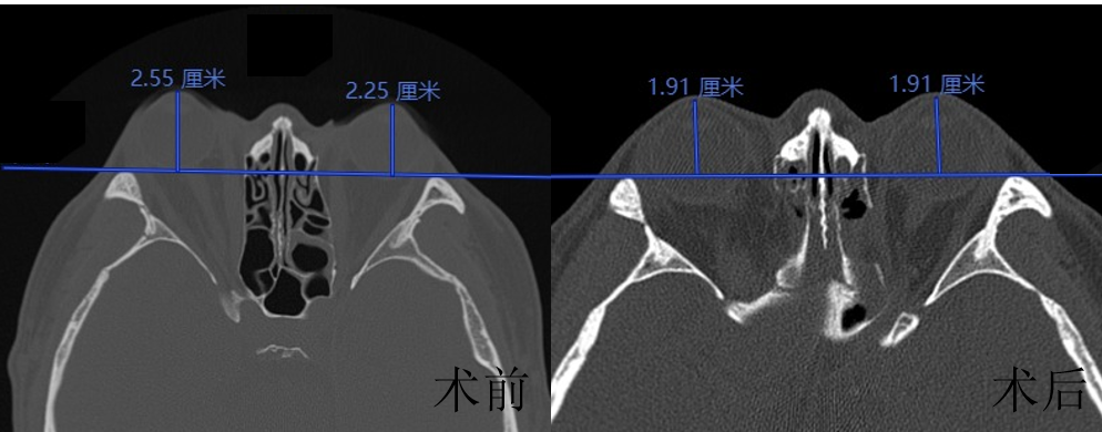 CT检查显示,患者术前双眼明显突出,且双眼突出程度不同;术后1月可见突出程度明显减轻