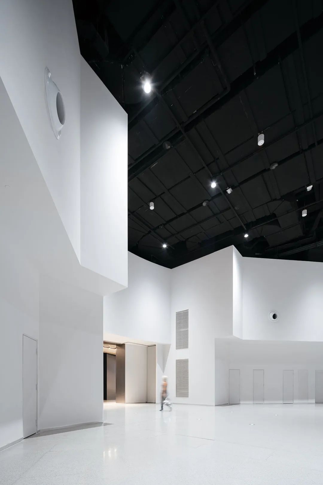 我根据漩涡的主题构建了整个室内设计情节。令人兴奋的漩涡占据了一层,其豪华高度为10m。大理石漩涡内是一个干净、多功能的大型活动大厅,用于展览、时装秀、会议等。漩涡图案体现在圆形走廊地板的划分上,同时创造出层次丰富的天花板。不同层次的图案有效隐藏了展厅立面与外墙之间的结构和设备管道,让漩涡在视觉上突出而不显得杂乱。漩涡成为主导的视觉元素,在视觉上最大化了象征意义的张力。