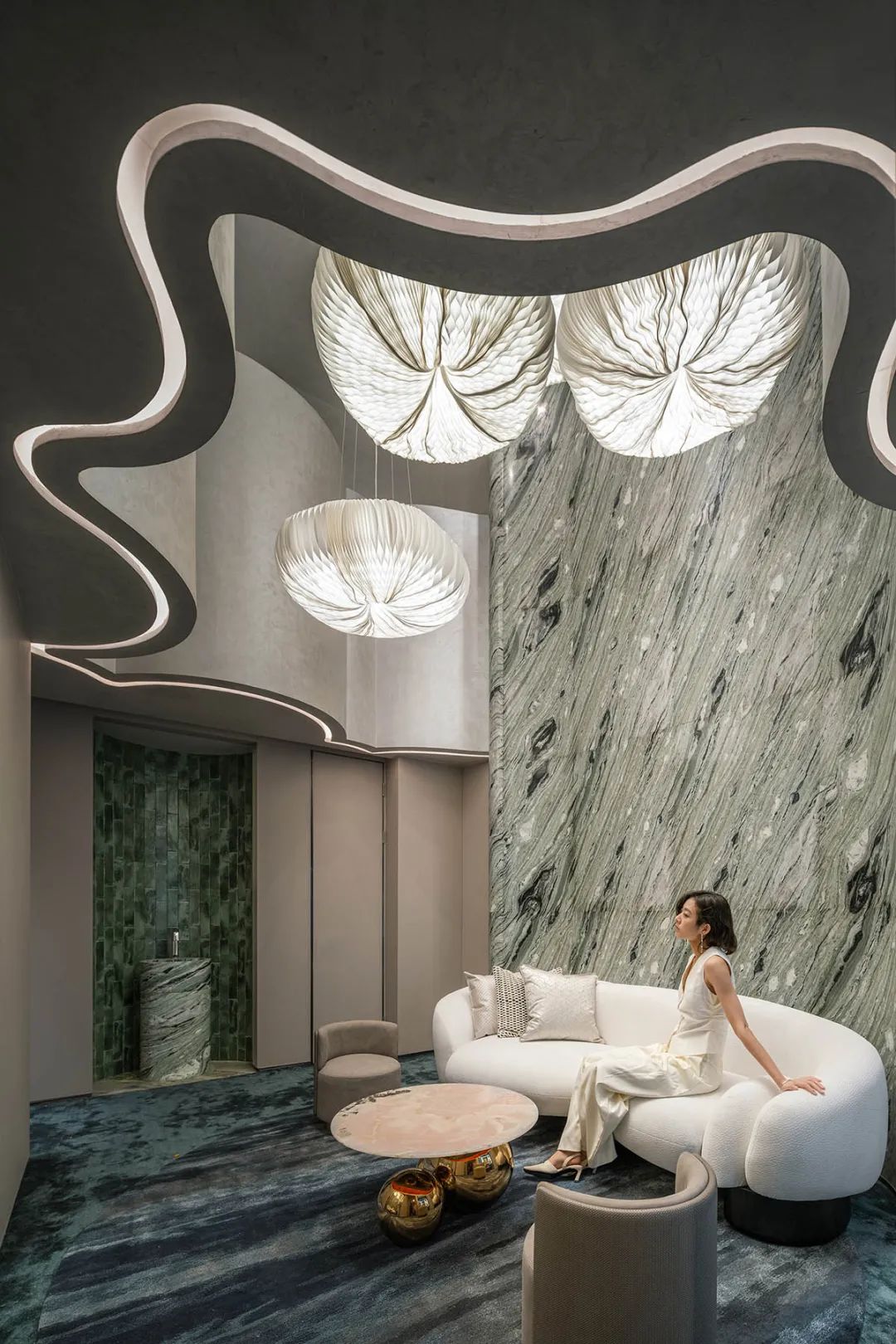 巨大的漩涡最终是通过五轴机器对大理石进行三维雕刻,然后在现场组装而成。它确实创造了一种巴洛克风格的感觉,大理石看似坚固,却表现出流体的动态力量。