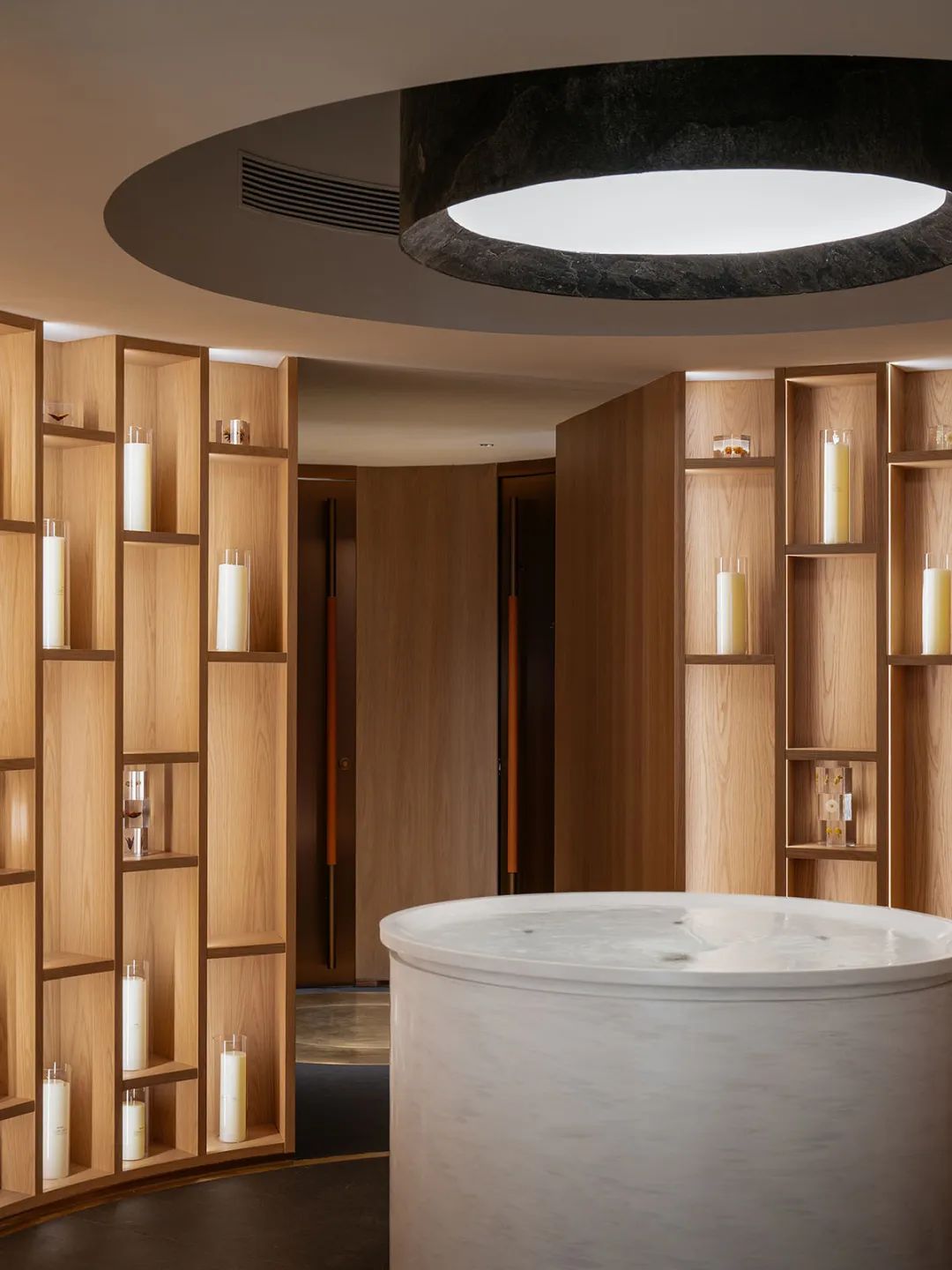 1F-中心大厅Orbit 的地下室具有功能性用途,设有公共走廊、公共卫生间、公共更衣室和 VIP 更衣室。它们代表了漩涡下方的海底世界。建筑师在走廊中创造了水下照明体验,并使用三种不同颜色的电镀石材,与珊瑚色的石材一起,在地下室层同时构建了水下珊瑚礁的象征意义。