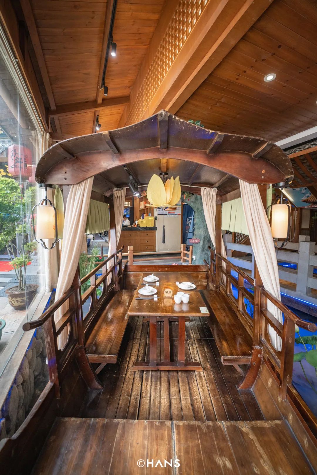 堂食畔水而设,想要用餐,先过拱桥再说。包间更厉害点,颔首入小船,进亭台,上楼阁。每个包间,都以知名地标命名,江汉路、汉正街……胸怀武汉三镇。有的店里,还会搭起一座水上戏台,专业人士现场表演。少女亭亭玉立,系上白色轻纱,犹抱琵琶半遮面,或是轻拢慢捻拂古琴。